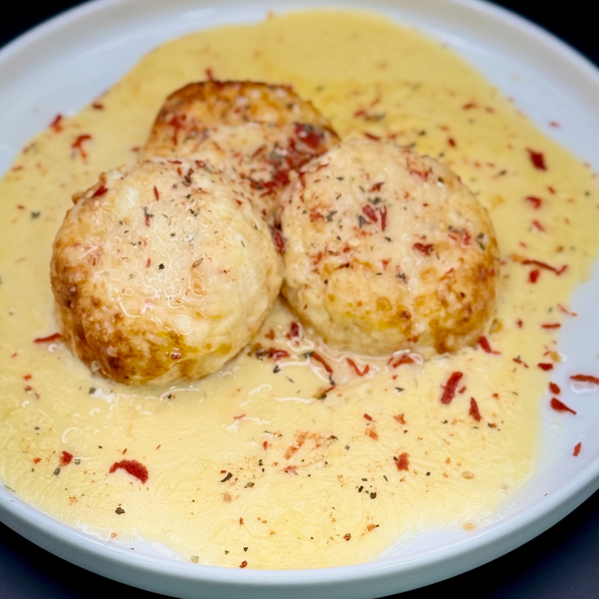 Delight in our cheese pancakes in Parmesan sauce, a savory breakfast option that redefines comfort food! These fluffy pancakes are made with rich cheese, creating a soft and flavorful base, then generously drizzled with a creamy Parmesan sauce that adds a deliciously cheesy twist. Perfect for those seeking a hearty and unique morning meal, they are sure to satisfy your cravings.